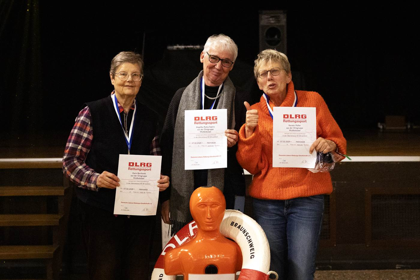 In der Altersklasse 65 weiblich lieferten sich die Mitglieder der Ortsgruppe untereinander einen spannenden Wettkampf. Auf Angelika Rasky-Sajonz (2.209,84 Punkte) folgten Karin Bernhardt (1.793,75 Punkte) auf dem zweiten und Kerstin Müller (1.563,63 Punkte) auf dem dritten Platz. Geschwommen wurden 50m Freistil, 50m kombiniertes Schwimmen und 25m Schleppen einer Puppe.